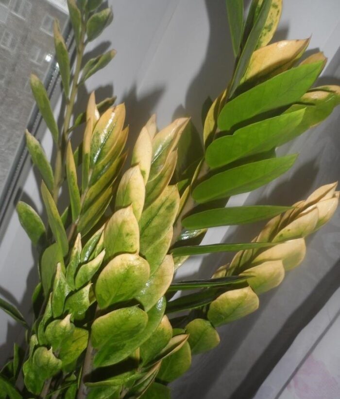 Замиокулькас неприхотлив к влажности окружающей атмосферы. Он получает влагу из почвы, накапливает ее в прикорневом стволе розетки и передает в черешки с листьями.
